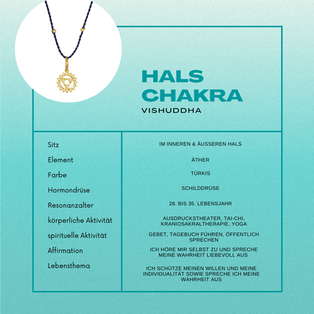 Das Vishuddha-Chakra (Kehl- oder Halschakra) befindet sich im inneren und äußeren Hals und ist das energetische Zentrum mit welchem wir uns auf jeder Erfahrungsebene austauschen können. Sitz, Element, Farbe, Affirmation, Thema (Hals Chakra Kette von Eternal Bliss mit Code “Matchamornings2021” -10% Rabatt)